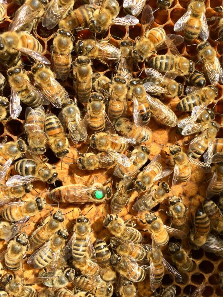 The queen is the only female bee in a colony who can mate with drones and store sperm. On her successful mating flight, she collects all the sperm she will have for the rest of her life: up to 5 years of egg-laying. Once back from that mating flight, she gets to work. Daily, she walks in concentric circles on each frame of hexagonal wax cells that the workers have built, using her feet to feel the size of the cell beneath her: it’s either a small cell, worker-bee sized, or a large one, drone-sized. In a small cell, she’ll put a fertilized egg—adding sperm before sticking her long abdomen in the cell and laying the egg at the bottom. This fertilized egg becomes a female worker bee. In a large cell, she’ll normally lay an unfertilized egg, one without added sperm, creating a drone.