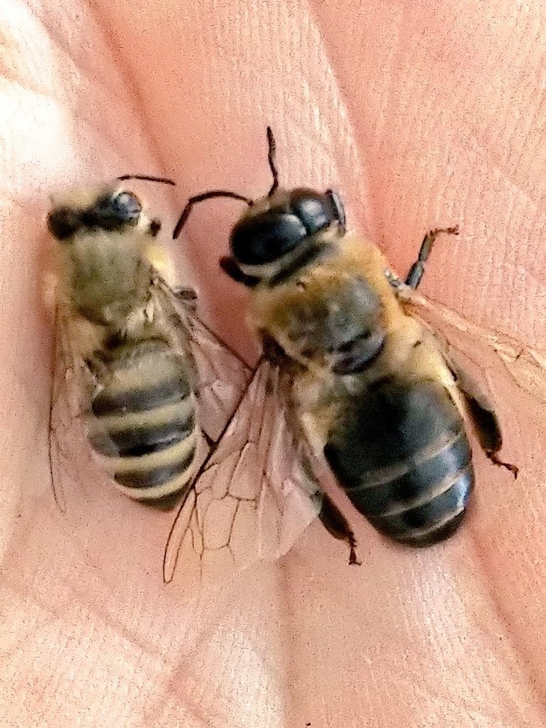 Male honey bees—drones—are big, strong, square-bottomed, with huge, acute eyes and large wings. They’re about 20% of the colony’s population, responsible for having keen eyesight, being exceptional flyers, and finding, then mating mid-air with, virgin queens from other colonies, to ensure the genetic diversity of the race.