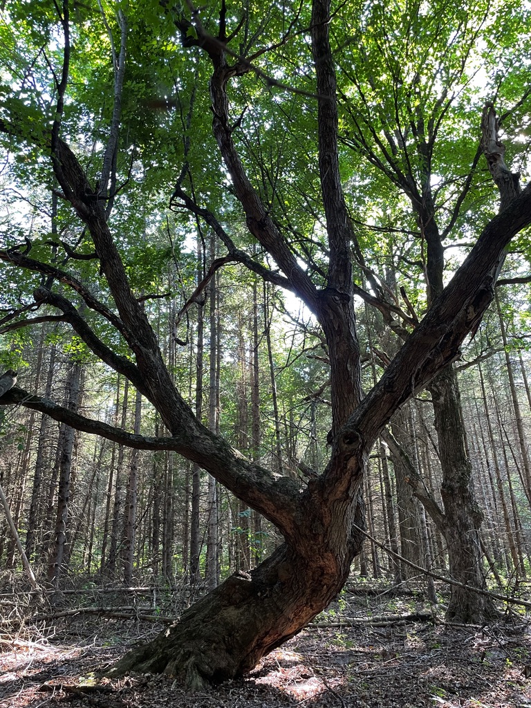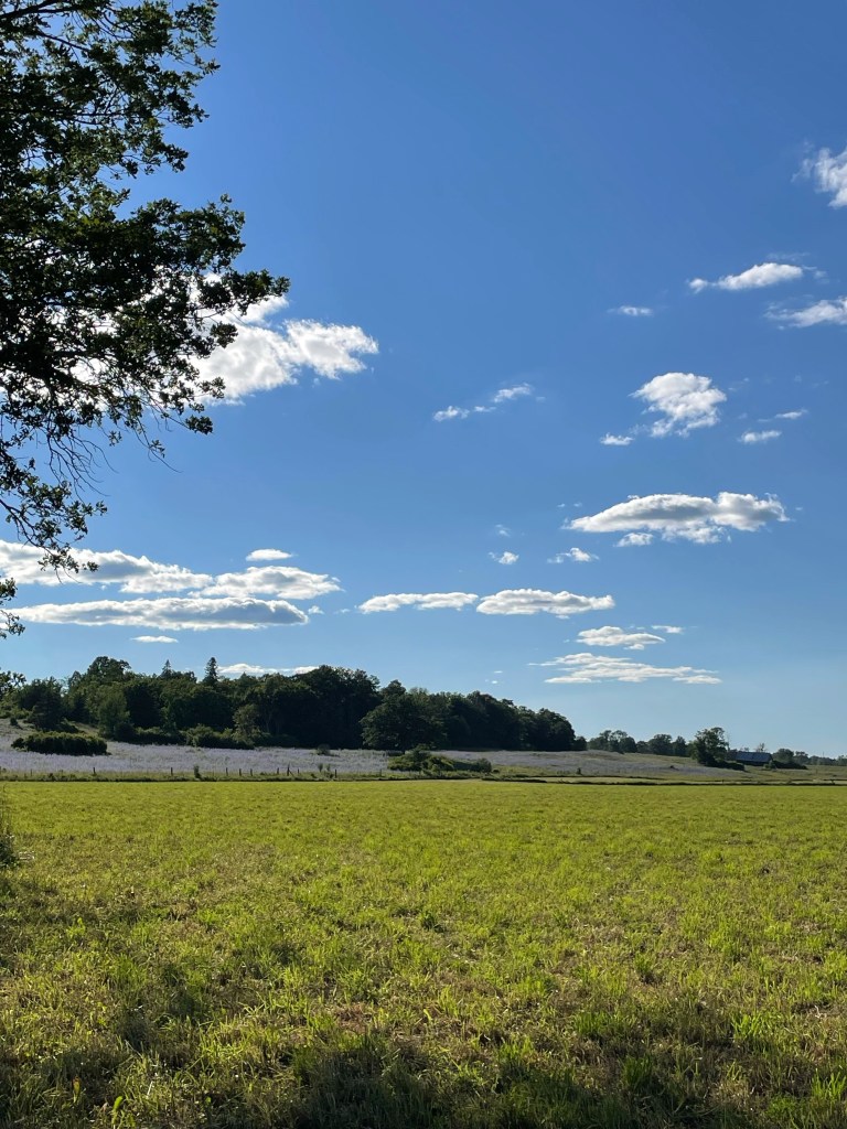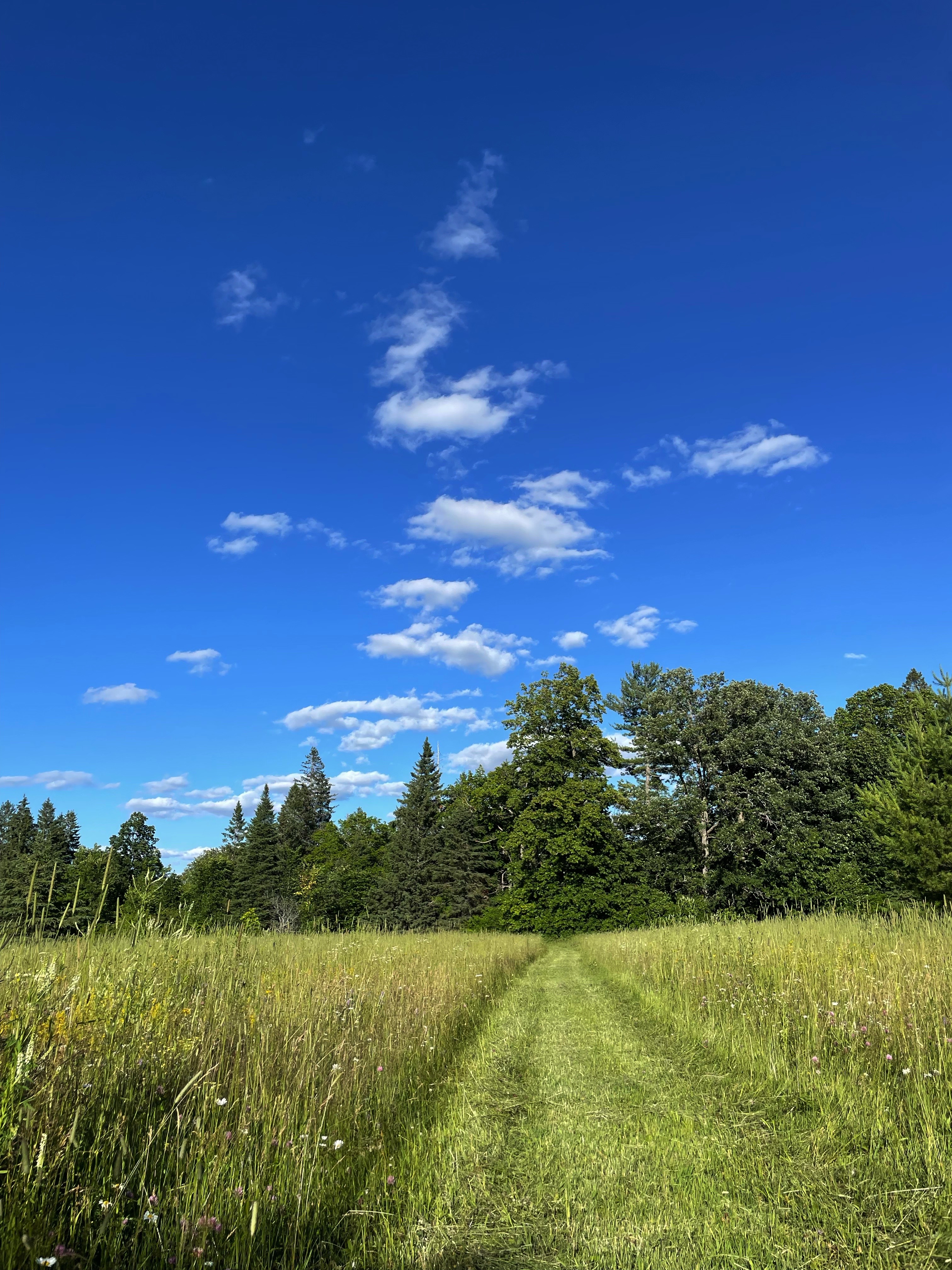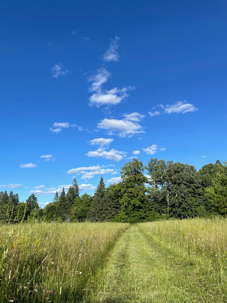 And I walked, along kilometres of trails cleared through meadows and woods, sometimes picking my way over uprooted trees that recent storms had downed, sometimes under the chittering of a red squirrel dashing along the branches, sometimes with the broad lavender vistas of sun-hot fields unfolding before me, acre over acre to the tree line.